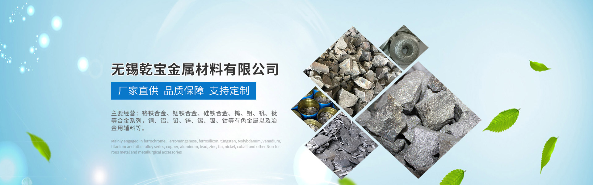無錫乾寶金屬材料有限公司成立于2009年元月,江蘇總部辦公地點位于無錫市新吳區菱湖大道228號天安智慧城7號樓502,江蘇倉儲中心位于無錫市新吳區城南路21-1號,多年以來公司經過不懈的努力,為了便捷服務客戶,先后在安徽省蕪湖市、廣東省佛山市、山東省青島市、浙江溫州市、河南省洛陽市等地設立合資公司、銷售分公司以及合金原輔材料倉儲庫。